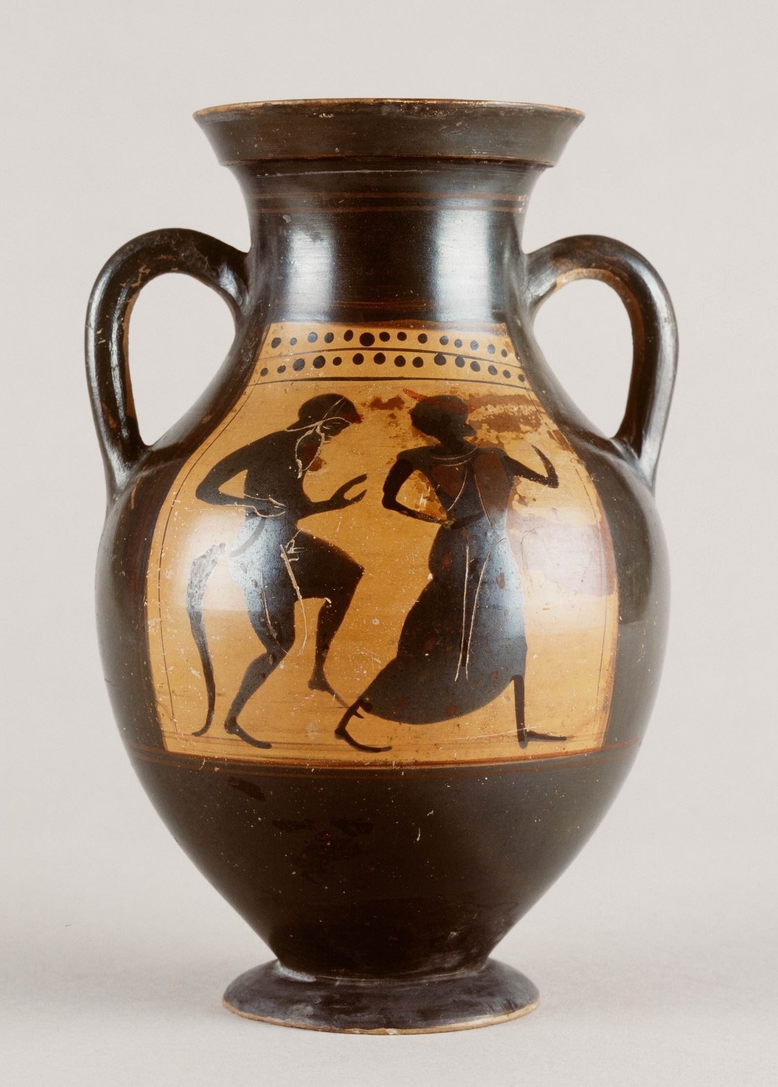 Anfora (Amphora, type B) attica a figure nere del Dot-ivy Group (520-510 a.C.). Integra. Tre lettere graffite sotto il piede. Riquadro metopale delimitato superiormente da catena di boccioli di loto rivolti verso il basso nel lato A, da due file di punti tra linee nere nel lato B; i pannelli sono delimitati ai lati da linee verticali e inferiormente da due linee rosse che circondano tutto il vaso. Sul lato A è raffigurata Atena verso destra tra due colonne doriche sormontate da galli, mentre avanza tenendo uno scudo su cui vi è dipinta la prora di una nave; rami sullo sfondo. Sul lato B, un satiro con una corona in mano e una menade con indosso una pelle animale, entrambi danzanti. La decorazione sovradipinta bianca e rossa evidenzia ulteriori dettagli dei corpi, delle armi e delle vesti.