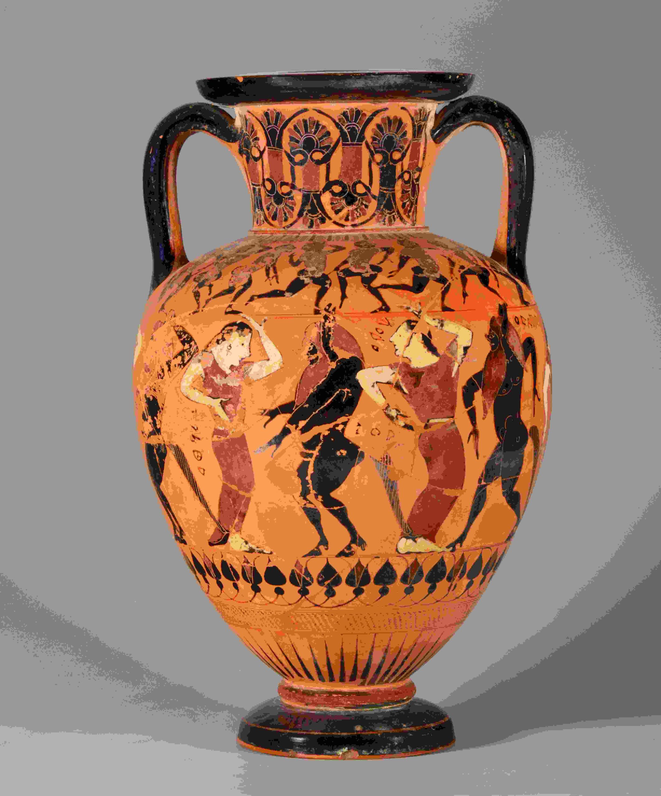 Anfora calcidese a figure nere del Pittore delle Iscrizioni (560-550 a.C.). Ricomposta da frammenti con integrazioni. Il collo è decorato con una catena di doppie palmette e fiori di loto per ogni lato. La decorazione principale, che si sviluppa sul corpo, è delimitata da linguette verticali nere e rosse alternate, separate e incorniciate da una linea ondulata, che scendono dalla spalla, e da un motivo a raggiera che parte dal piede, sovrastato da una fila di linee oblique e da una catena di boccioli di loto intrecciati da archetti, tutti tra due linee orizzontali. Sulla spalla, tra le due anse, gruppi di danzatori con vesti rosse. Il fregio principale unico, delimitato in alto da due linee nere in parte oltrepassate dalle mani dei personaggi, presenta un’alternanza di satiri e menadi danzanti, con nomi incisi accanto ai personaggi. La decorazione sovradipinta bianca e rossa evidenzia ulteriori dettagli dei corpi e delle vesti.