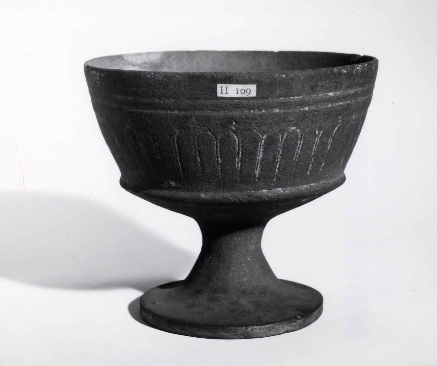 Calice in bucchero grigio (tipo 3a Rasmussen; forma 2832f1 Gran-Aymerich) con orlo assottigliato, vasca carenata e profonda, decorata da tre linee orizzontali parallele tra loro (di cui la prima appena percepibile) e da baccellature. La carena è evidenziata da un rigonfiamento ed il fondo si innesta su un alto piede a tromba; quest’ultimo è stato restaurato. La decorazione, piuttosto insolita per il tipo di calice, sembra voler imitare gli esemplari con baccellature plastiche o, più probabilmente, i vasi bronzei che presentano la stessa decorazione incisa. Il tipo, databile alla prima metà del VI secolo a.C., non è frequentemente attestato a Vulci e può essere riferito a botteghe chiusine o, meno verosimilmente, orvietane.