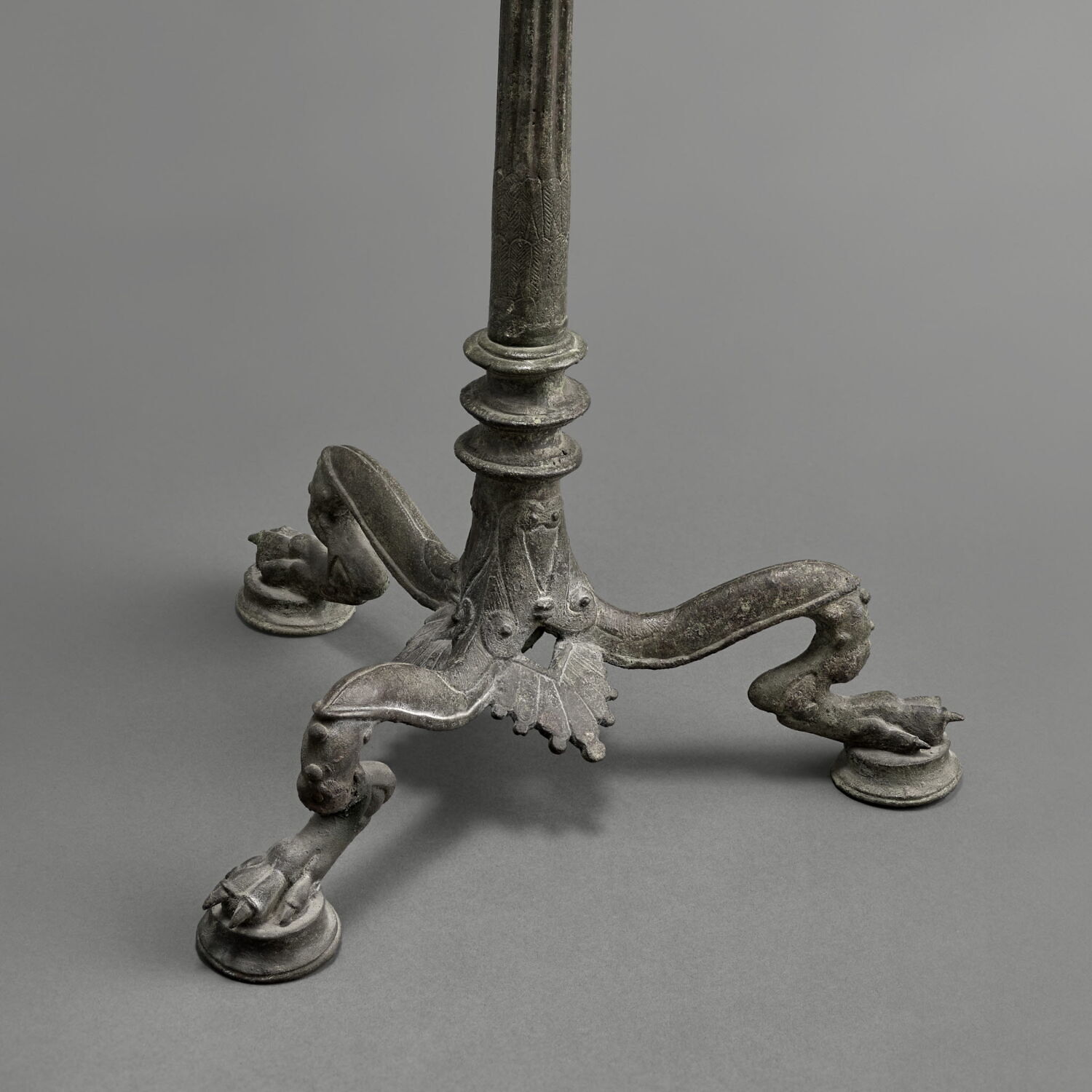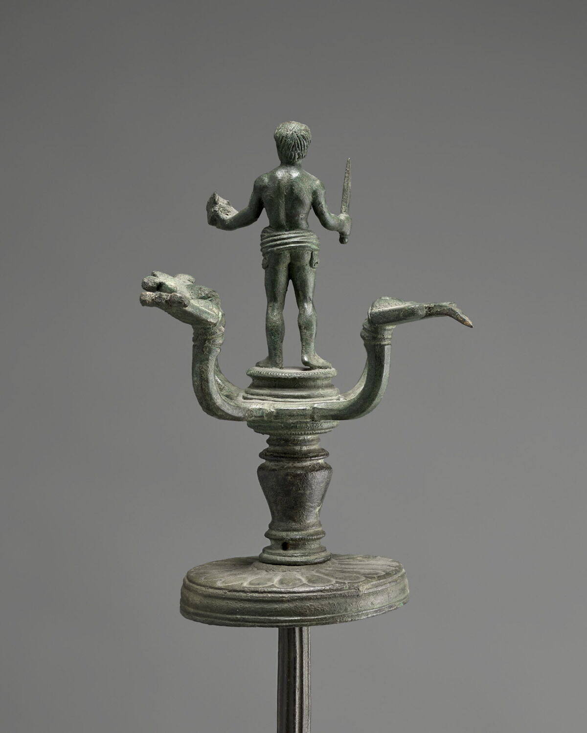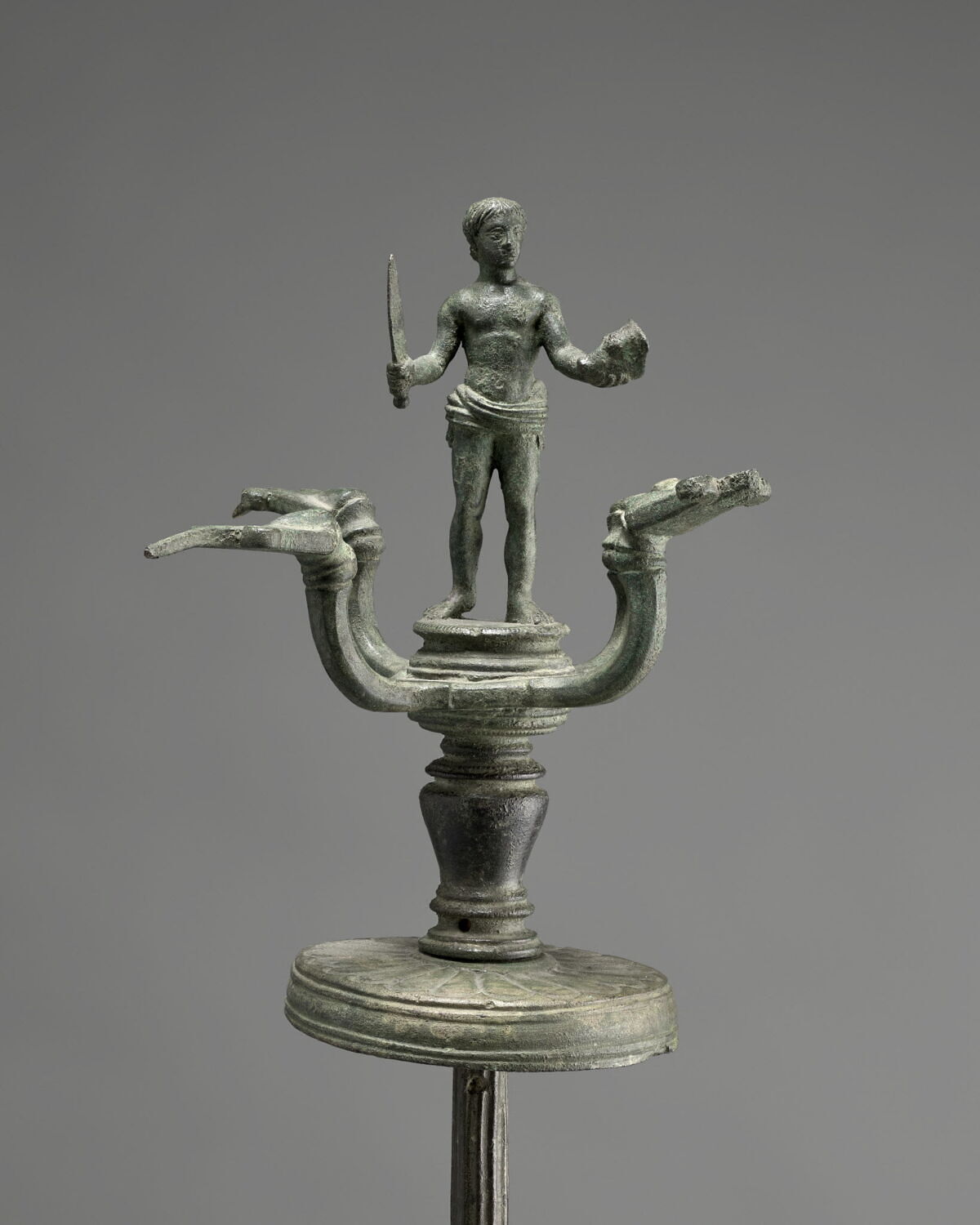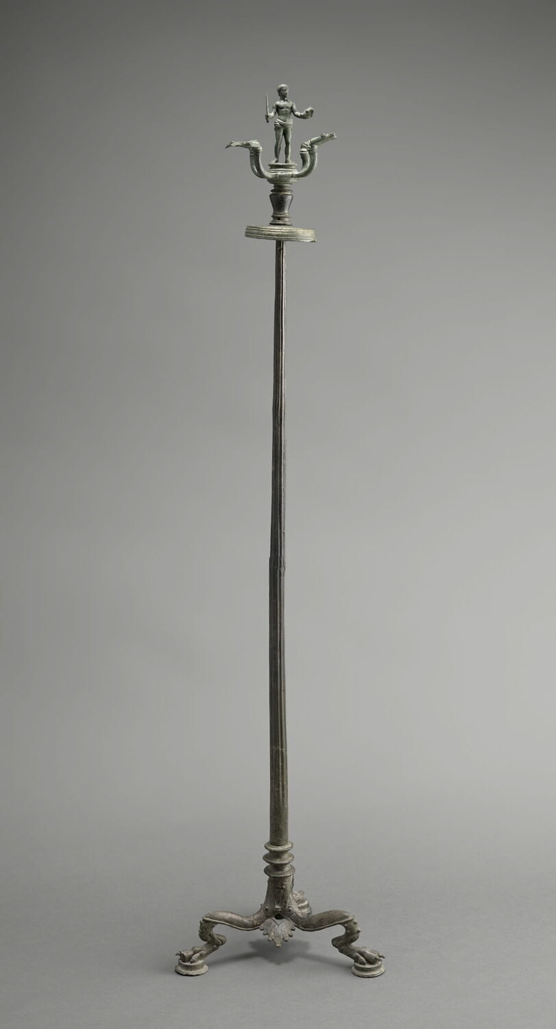 Candelabro in bronzo composto da un treppiede conformato a zampe leonine su basette circolari, raccordate da palmette, sormontato da tre modanature, e da un fusto scanalato. La parte superiore del candelabro è decorata con una figura maschile seminuda, che brandisce una spada e una testa animale. Il candelabro rientra in una delle maggiori produzioni di bronzo vulcenti del IV secolo a.C.