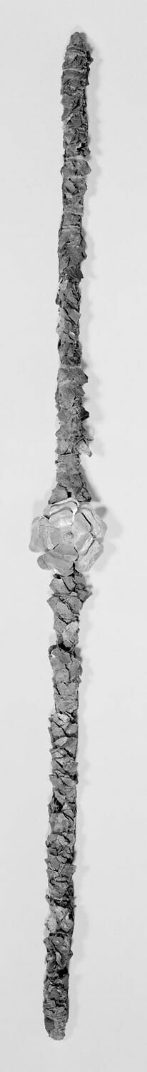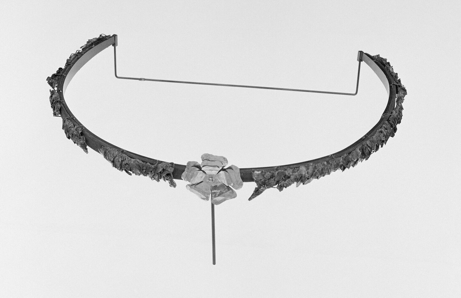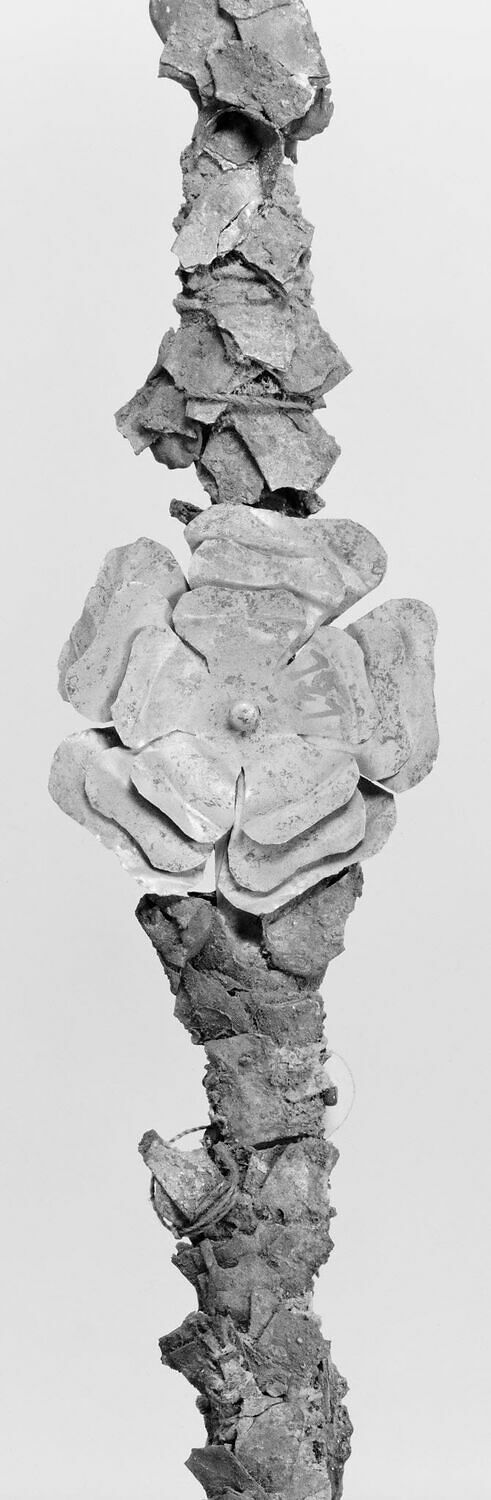 Diadema composto da una fascia di foglie di mirto in rame dorato, fortemente ossidata, e da una rosetta centrale formata da tre lamine d’oro sovrapposte con cinque petali. Il pistillo è rappresentato da una perlina. Il diadema era originariamente arricchito da bacche alle estremità delle foglie. Il diadema è stato inserito da A. Coen nel tipo VB, databile tra il III – II secolo aC. Questo gioiello è stato utilizzato come modello per una delle creazioni della collezione Castellani conservata al Museo Nazionale Etrusco di Villa Giulia.