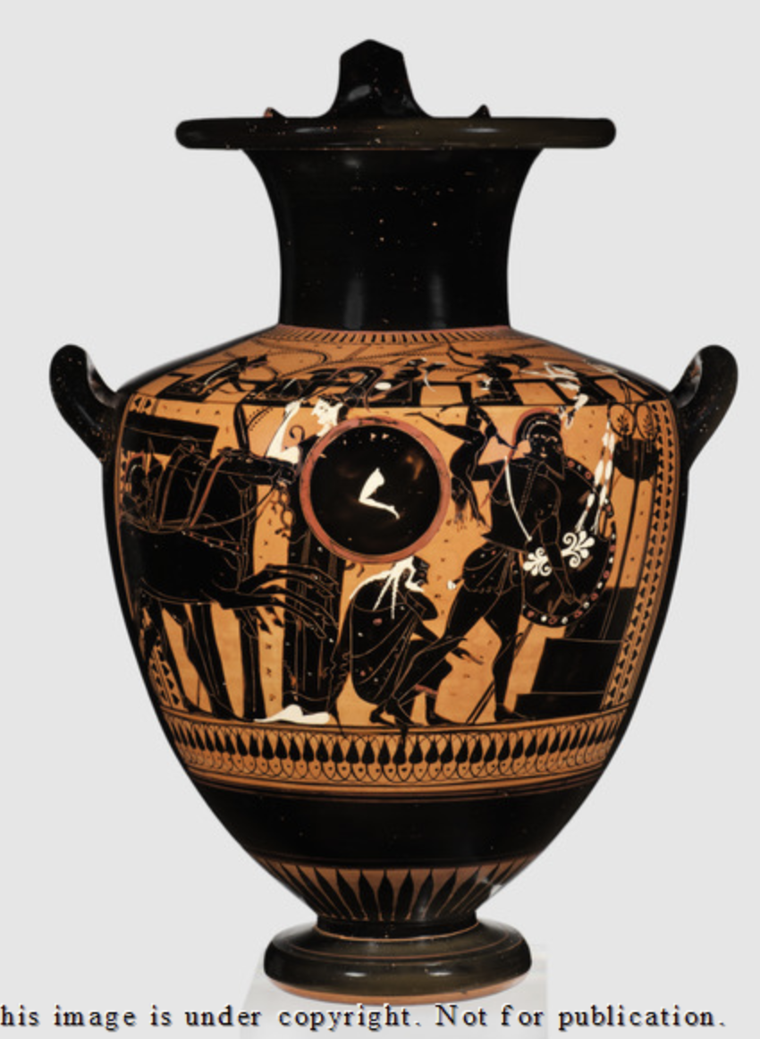 Hydria a figure nere vicina al gruppo di Leagros. Integra. Mancante di piccole porzioni presso l’orlo ed il collo. Presso il collo, tra un motivo a linguette e una linea orizzontale, presso le mura di Troia arcieri, guerrieri e donne. Presso la spalla, sotto il margine superiore: (ν)ιδ(.)(ν)ο(.)(ρ)(λ). Al di sotto, tra un motivo ad edera e uno a a boccioli di loto ad archetti, a sinistra gruppo di cavalli e due guerrieri incedenti verso destra, al centro Atena rivolta verso destra dotata di elmo e scudo, a destra Priamo rannicchiato e Achille intento ad uccidere Troilo presso un altare. Ulteriori dettagli dipinti definiscono le vesti e le armi. Presso il ventre: (v) (.)επσ. νχι. κνδ. πχκδει, νχεσ. Si data tra il 550 e il 500 a.C.