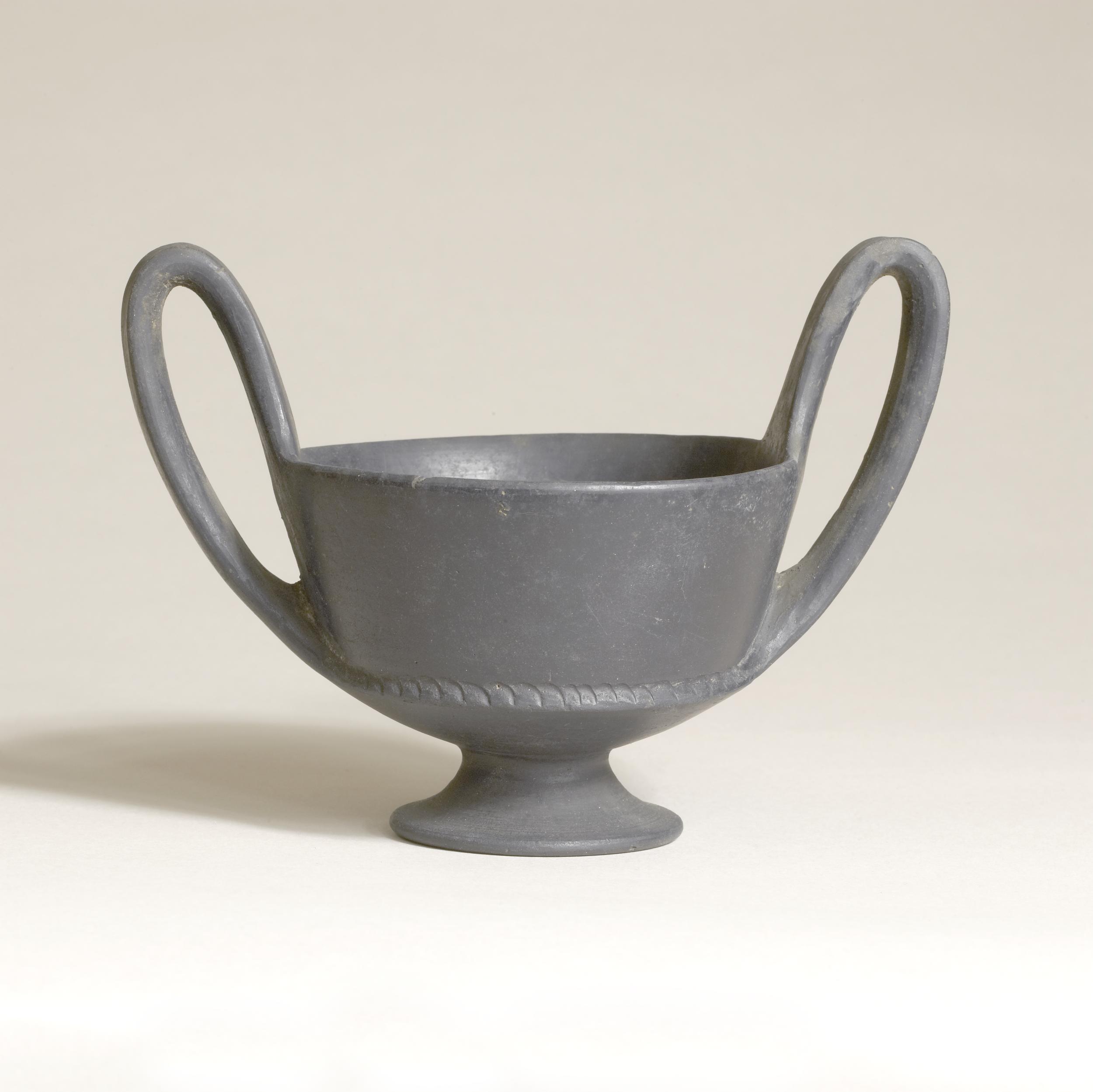 Kantharos in bucchero (Tipo 3e Rasmussen, Forma 3760 Gran-Aymerich). Orlo arrotondato, labbro indistinto, anse a nastro sormontanti, vasca carenata decorata con motivo ad archetti, basso piede a tromba; l’oggetto presenta alcune scheggiature. Questo tipo di vaso, probabilmente prodotto in Etruria meridionale, è piuttosto diffuso sia localmente sia nel resto del Mediterraneo (in particolare se ne hanno attestazioni in Francia, a Cartagine, in Sardegna e in Sicilia), e sembra aver ispirato gli esemplari attici di poco recenziori. Si data tra il 625 e il 550 a.C.