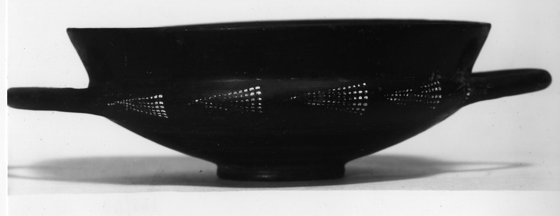 Kylix in bucchero (tipo 1c Rasmussen; forma 4124a2 Gran-Aymerich), caratterizzata da un orlo svasato ed anse orizzontali dalla sezione circolare. La vasca, poco profonda, è esternamente interessata da decorazioni incise, costituite da un fregio di nove ventaglietti realizzati a punti ed aperti a destra, collocati in corrispondenza delle anse, e da tre fasce di scanalature nella parte inferiore del vaso; il piede è ad anello. Il manufatto è scheggiato in più punti. La forma è stata mutuata dagli skyphoi protocorinzi e trova in Cerveteri il suo principale centro di produzione. Il tipo è attestato prevalentemente nell’Etruria meridionale ed interna tra il 650 ed il 600 a.C.