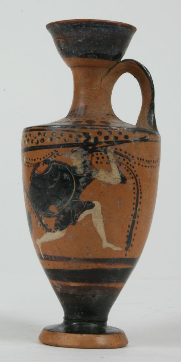 Lekythos attica a figure nere della Classe di Atene 581 (500-475 a.C.). Orlo piatto, bocchello troncoconico, collo verticale, spalla alta carenata, corpo piriforme, piede distinto. Orlo rotto e reintegrato, parte del piede mancante. Linguette sul collo sopra a un motivo a raggiera (semplificazione della catena di boccioli di loto) con punti al di sotto. Sopra al riquadro dipinto sul corpo, subito sotto la spalla, doppia linea di punti neri e bianchi tra linee; sotto alla raffigurazione, linea nera. Sul corpo del vaso sono rappresentate due Amazzoni, in corsa in direzioni opposte, entrambe con indosso un corto chitone con sopra una pelle di animale, un elmo e uno scudo (una recante uno scudo a pelta con tre sfere dipinte, l’altra dotata di uno scudo beota avente come episema un fulmine) e una lancia. La decorazione sovradipinta bianca e rossa evidenzia ulteriori dettagli dei corpi, delle armi e delle vesti.