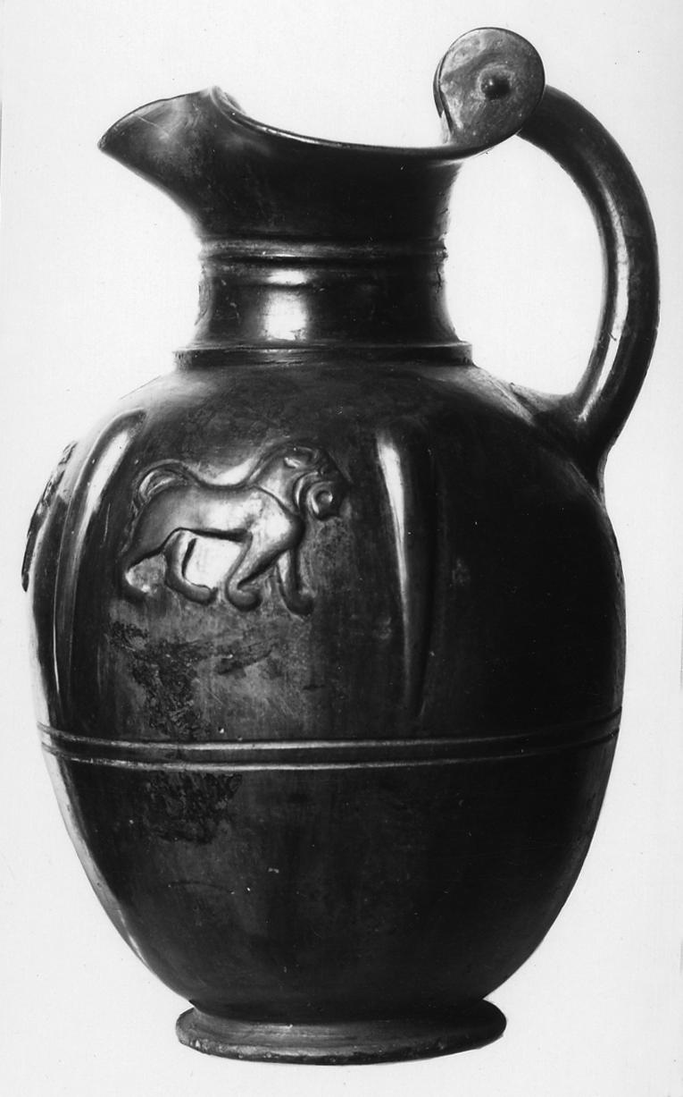 Oinochoe in bucchero grigio (tipo 3d Rasmussen/ Gsell 63; forma 5669b1 Gran-Aymerich), con imboccatura trilobata, collo modanato ed ansa a sezione circolare desinente a rotelle. Il corpo ovoide è caratterizzato da un fregio realizzato a stampo sulla spalla: vi sono rappresentati tre leoni incedenti verso sinistra, con fauci spalancate e coda ripiegata sulla schiena, separati da grandi gocce allungate. Al di sotto della raffigurazione sono presenti due scanalature, mentre il piede è ad anello; sulla superficie lucida si osservano tracce di incrostazioni calcaree. L’oinochoe appartiene alle produzioni in bucchero pesante vulcente, un gruppo ampio ed omogeneo i cui esemplari differiscono per piccoli dettagli decorativi; tali elementi permettono di ascrivere il vaso qui analizzato alla metà del VI secolo a.C.