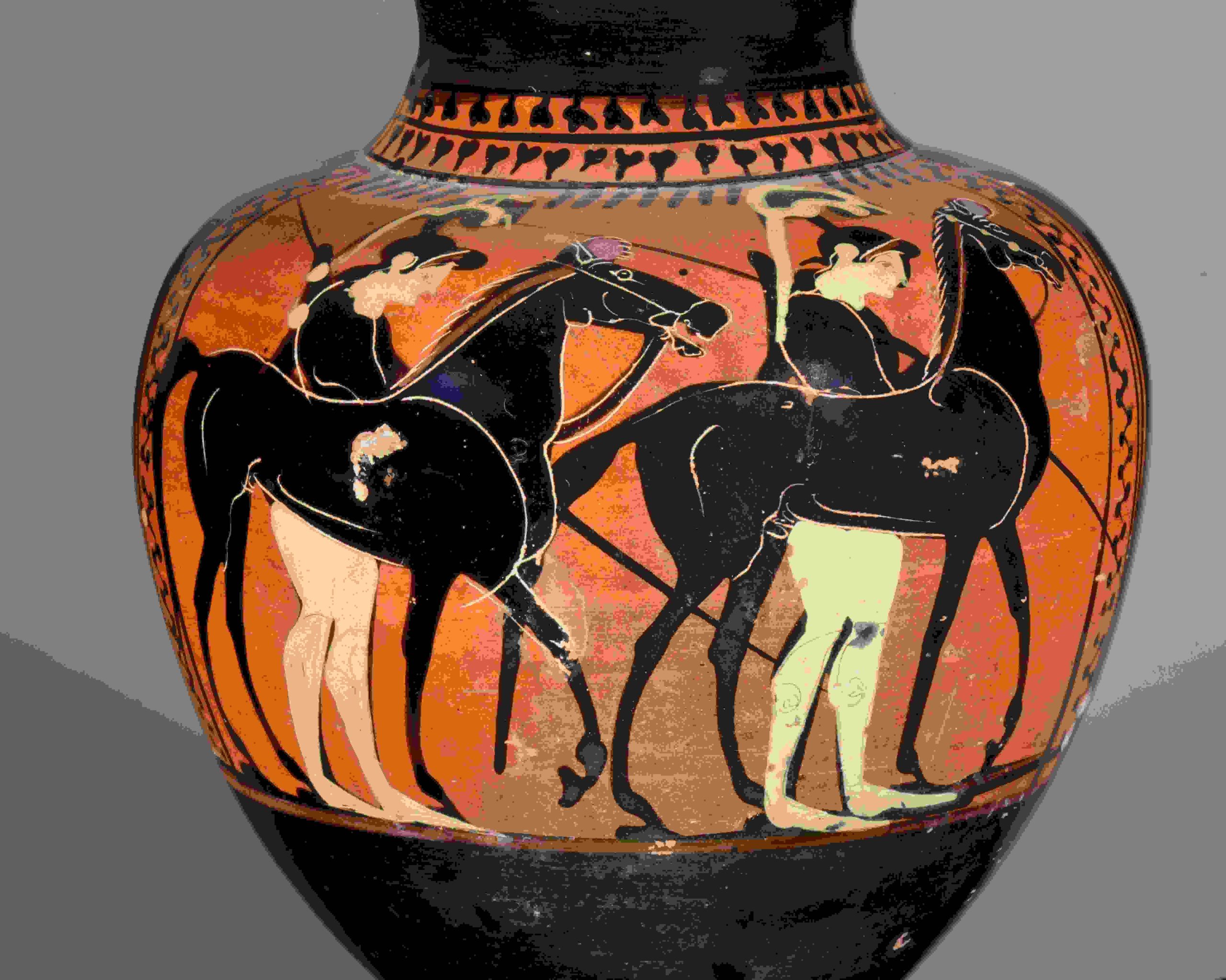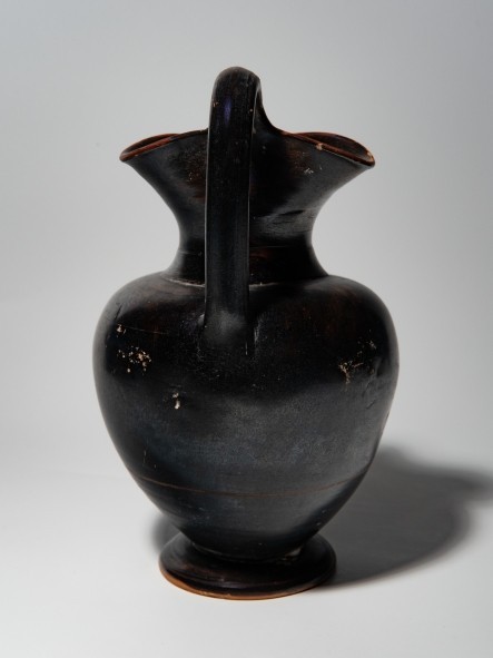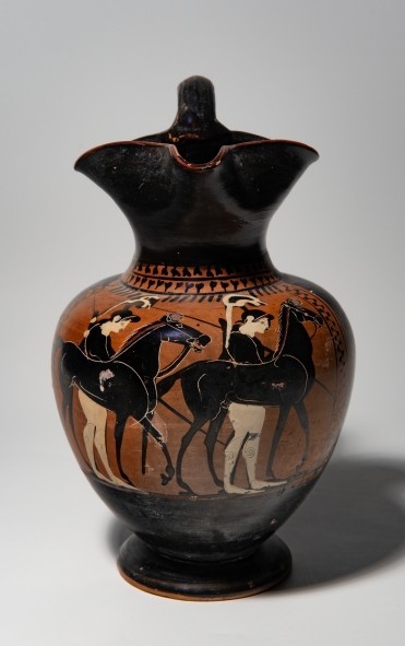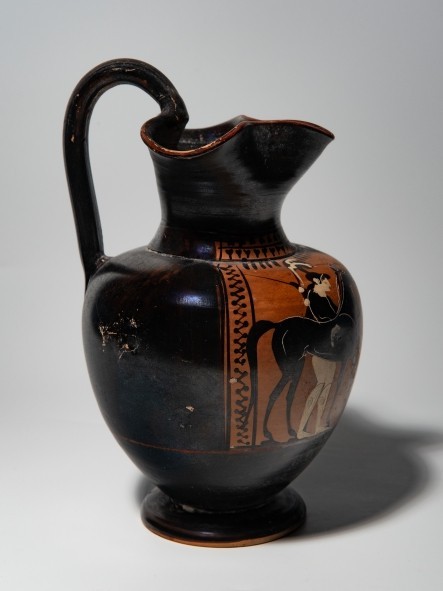 Oinochoe trilobata attica a figure nere del Pittore e della Classe di Londra B 495 (ca. 500 a.C.). Integra, con piccole sbeccature; incisioni moderne sulle gambe delle amazzoni ad indicare i guanti e le scarpe. Alla base del collo, due file di foglie di edera su un ramo centrale. Pannello metopale risparmiato centrale, delimitato superiormente da linguette e lateralmente da due file di punti, connessi da una linea a zig-zag tra due linee verticali, e nella parte inferiore da una linea rossa che delimita tutto il quadro metopale. Nella metopa due Amazzoni, con chitone, elmo, scudo sulla spalla e lancia, che camminano accanto ai cavalli verso destra. La decorazione sovradipinta bianca e rossa evidenzia ulteriori dettagli dei corpi, delle armi e delle vesti.
