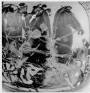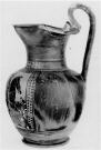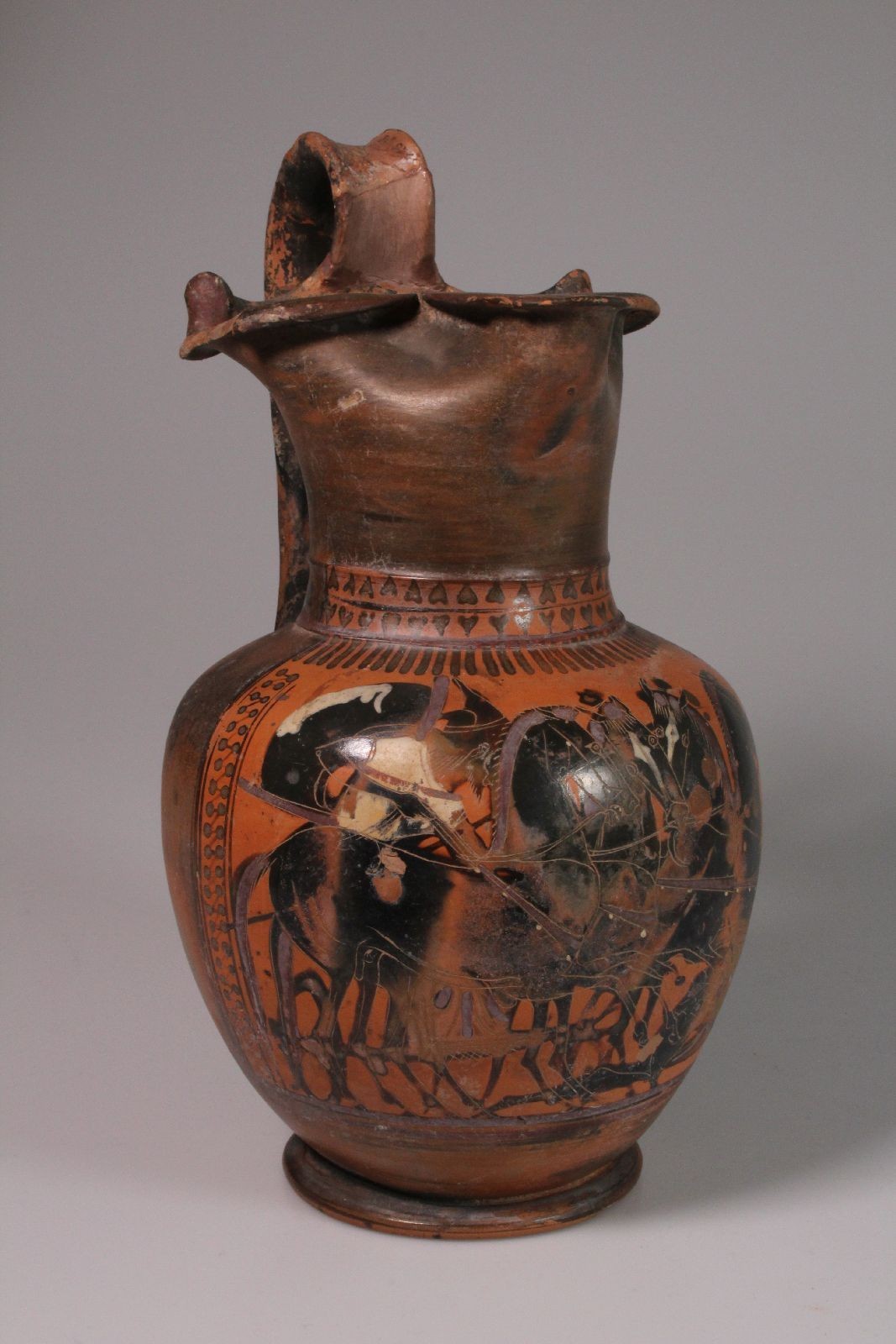 Oinochoe trilobata attica a figure nere della Classe del Vaticano G 47 (510-500 a.C.). Ansa reintegrata, frammento dell’imboccatura mancante. Sulla parte inferiore del collo, modanature a rilievo, con parte centrale risparmiata e dipinta con una doppia fila di foglie di edera, con sotto una linea rossa. Pannello metopale risparmiato centrale, delimitato sopra da linguette, di lato da una doppia fila di punti connessi da una linea a zig-zag tra linee verticali e, nella parte inferiore, da due linee rosse che circondano tutto il pannello. Nella metopa è raffigurata una quadriga di tre quarti al trotto verso destra, con un guerriero caduto intrappolato sotto ai cavalli. L’auriga indossa un lungo chitone bianco e un copricapo conico (pilos) sulla testa, con un grande scudo sulla schiena. L’oplita caduto indossa un corto chitone, con elmo, guanti, scudo e lancia. La decorazione sovradipinta bianca e rossa evidenzia ulteriori dettagli dei corpi, delle armi e delle vesti.