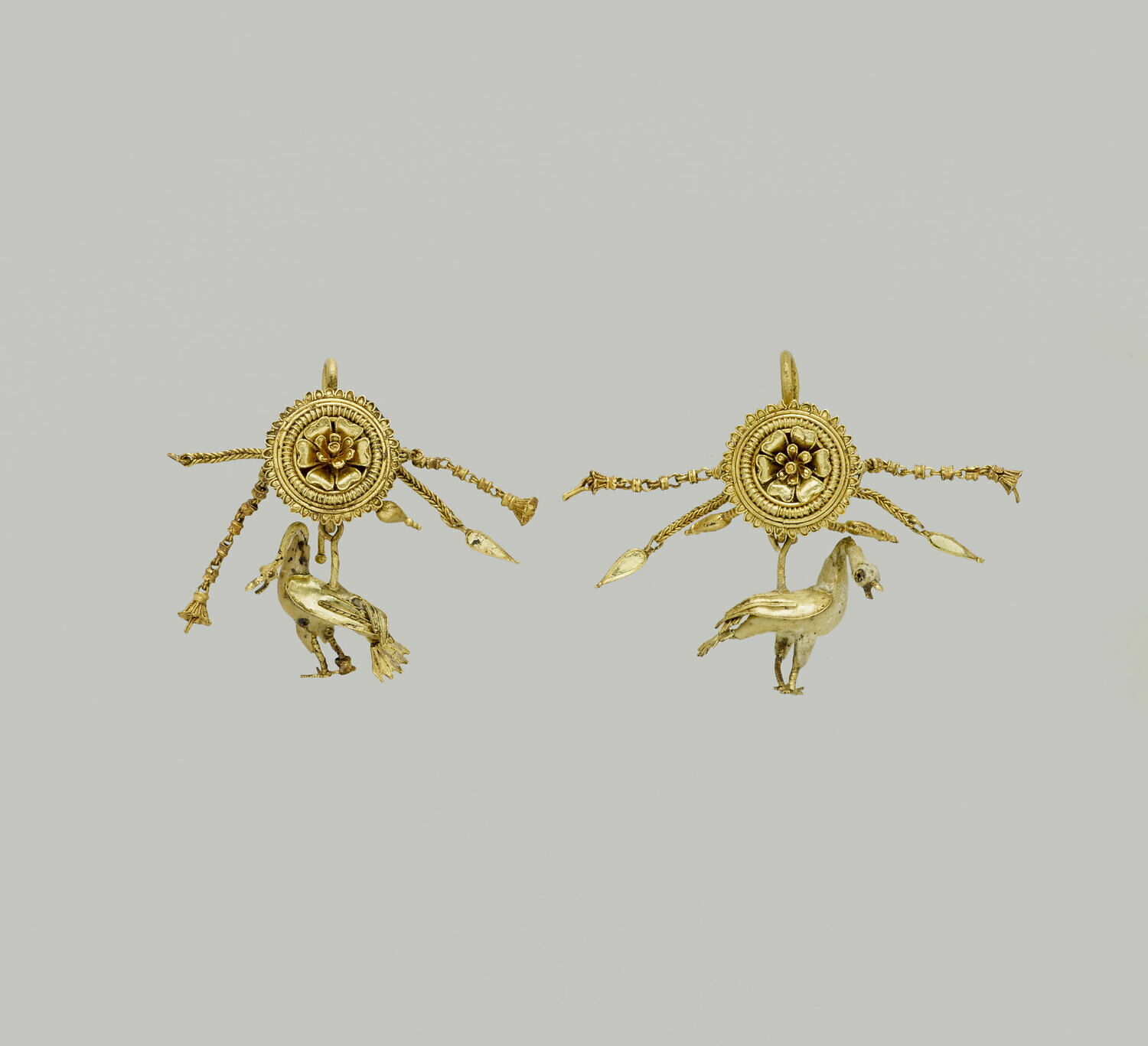 Coppia di orecchini d’oro composti da un disco e da un pendente in pasta vitrea bianca e oro a forma di cigno. Il disco è ornato da una rosetta centrale doppia a sei petali, da un filo godronato e da due fili lisci. La composizione si conclude con un cerchio di linguette filigranate. Dal disco partono sei catene d’oro desinenti a fiore, pietra, oppure a ghianda e granuli. Il cigno è fissato alla sospensione mediante un gancio. Il becco dell’uccello è aperto, il collo è piegato e le ali sono chiuse sul corpo. Il tipo è diffuso in Etruria e in Magna Grecia durante l’età ellenistica. Questo gioiello è stato utilizzato come modello per una delle creazioni della collezione Castellani conservata al Museo Nazionale Etrusco di Villa Giulia.