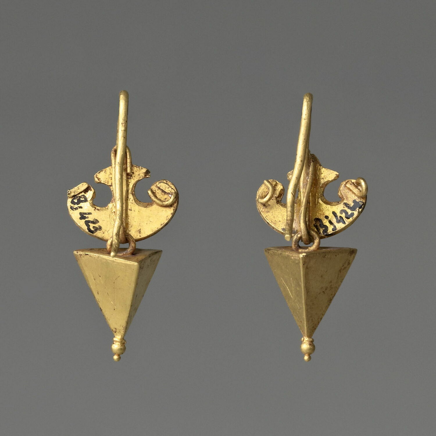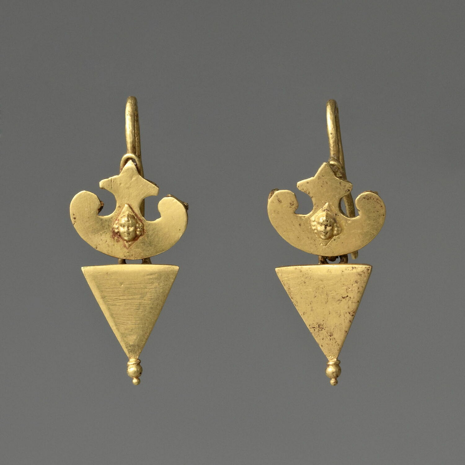 Coppia di orecchini d’oro composti da una pelta (scudo di Amazzone) martellata e da un pendente a piramide rovesciata, con una perla e una granula saldate al vertice inferiore. La pelta è ornata da una testa di Eros in rilievo su una lamina d’oro a forma di losanga e saldata nella parte centrale. Il tipo è caratteristico dell’età ellenistica e viene spesso utilizzato come ornamento delle figure femminili ripresentate su diversi classi di materiale (ceramica, monete, sarcofagi, ecc.).