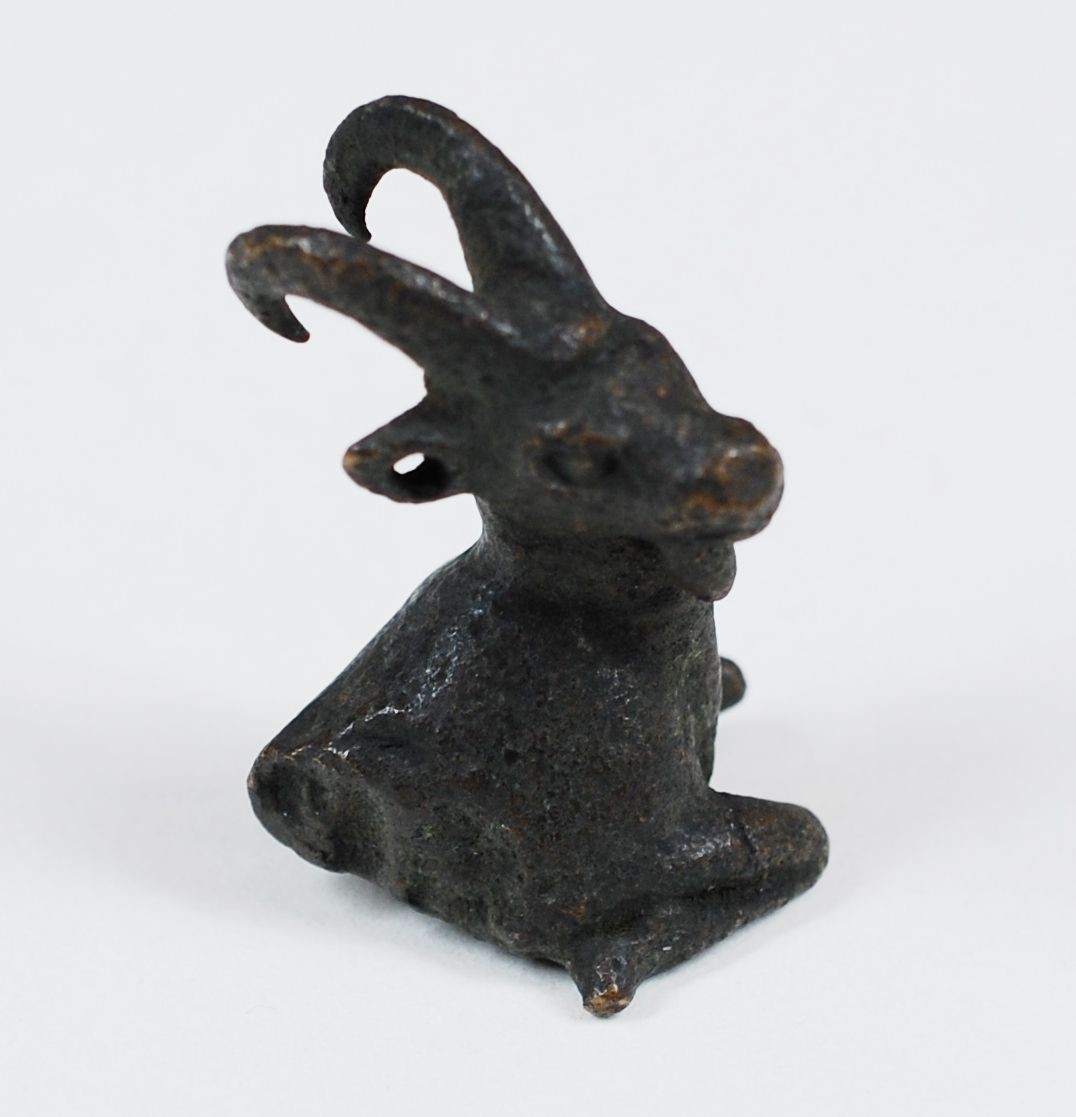 Statuetta in bronzo a forma di protome di ariete. Le due zampe anteriori sono reclinate verso il busto in corrispondenza della base dell’oggetto, mentre la testa è girata verso destra. Corna ricurve verso il retro, orecchie forate. L’oggetto si data probabilmente al V sec. a.C.
